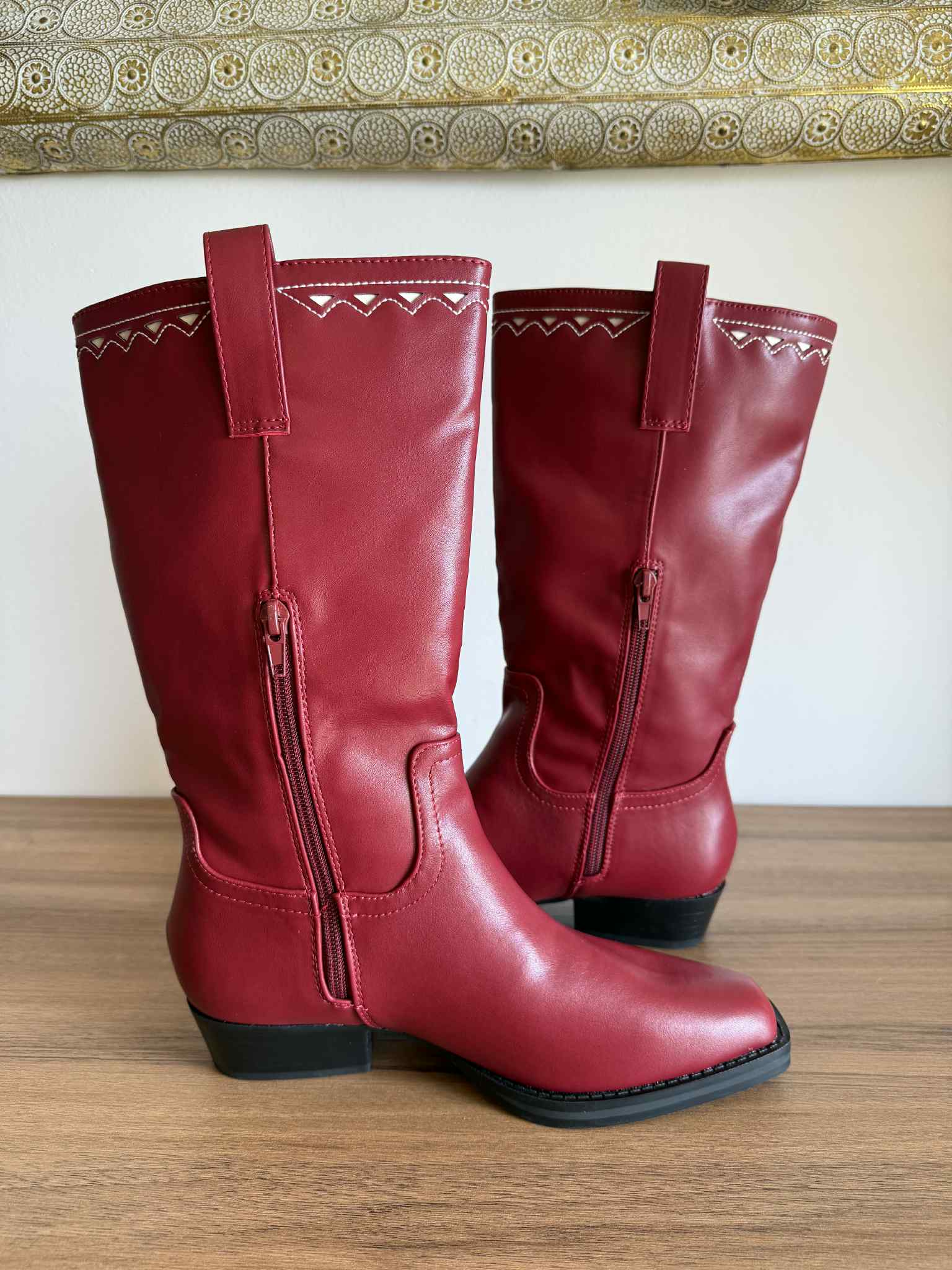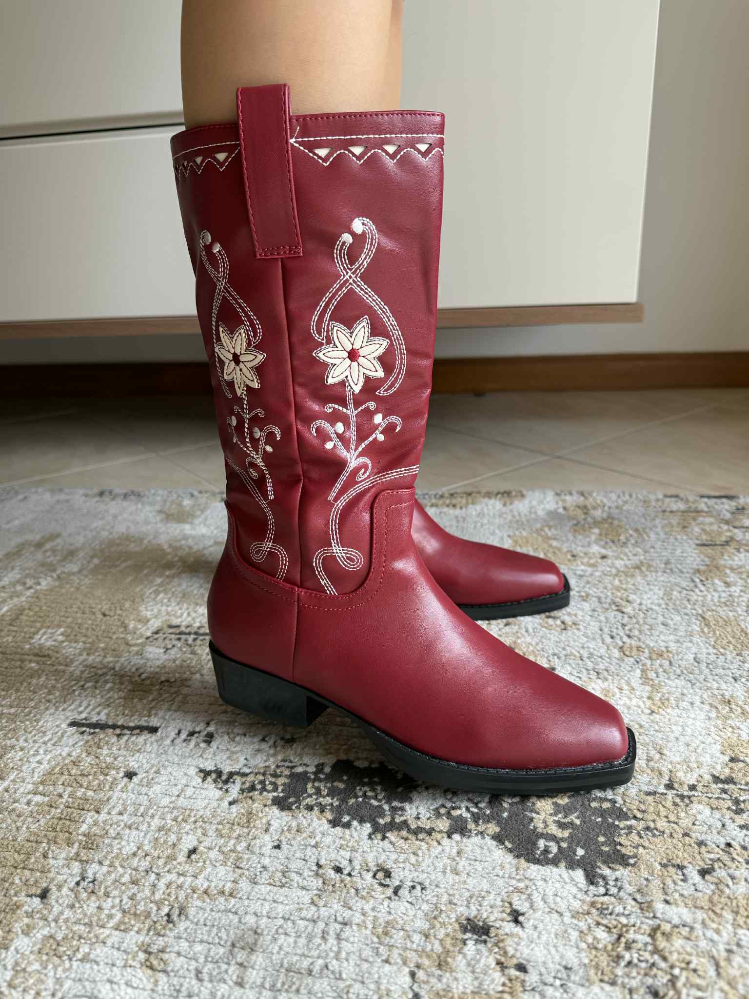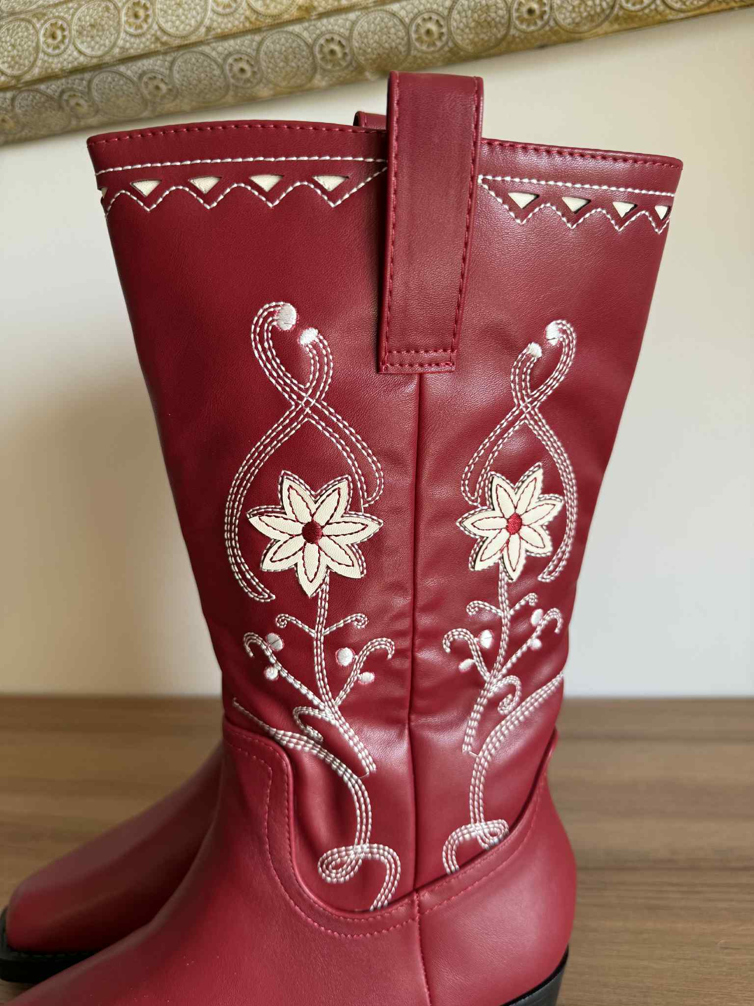 Bota estilo texana, em pele sintética. De cano alto com detalhes bordados. Frente quadrada. Tacão largo com 3.5cm de altura. Tem fecho.