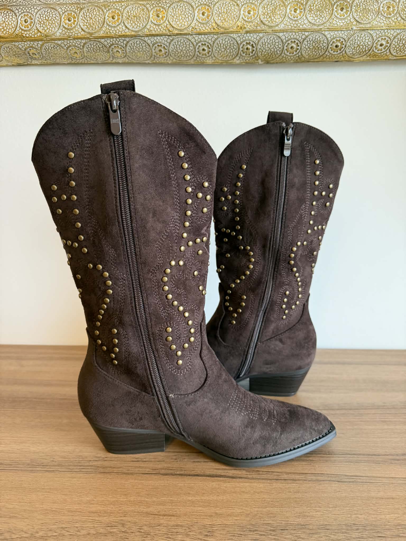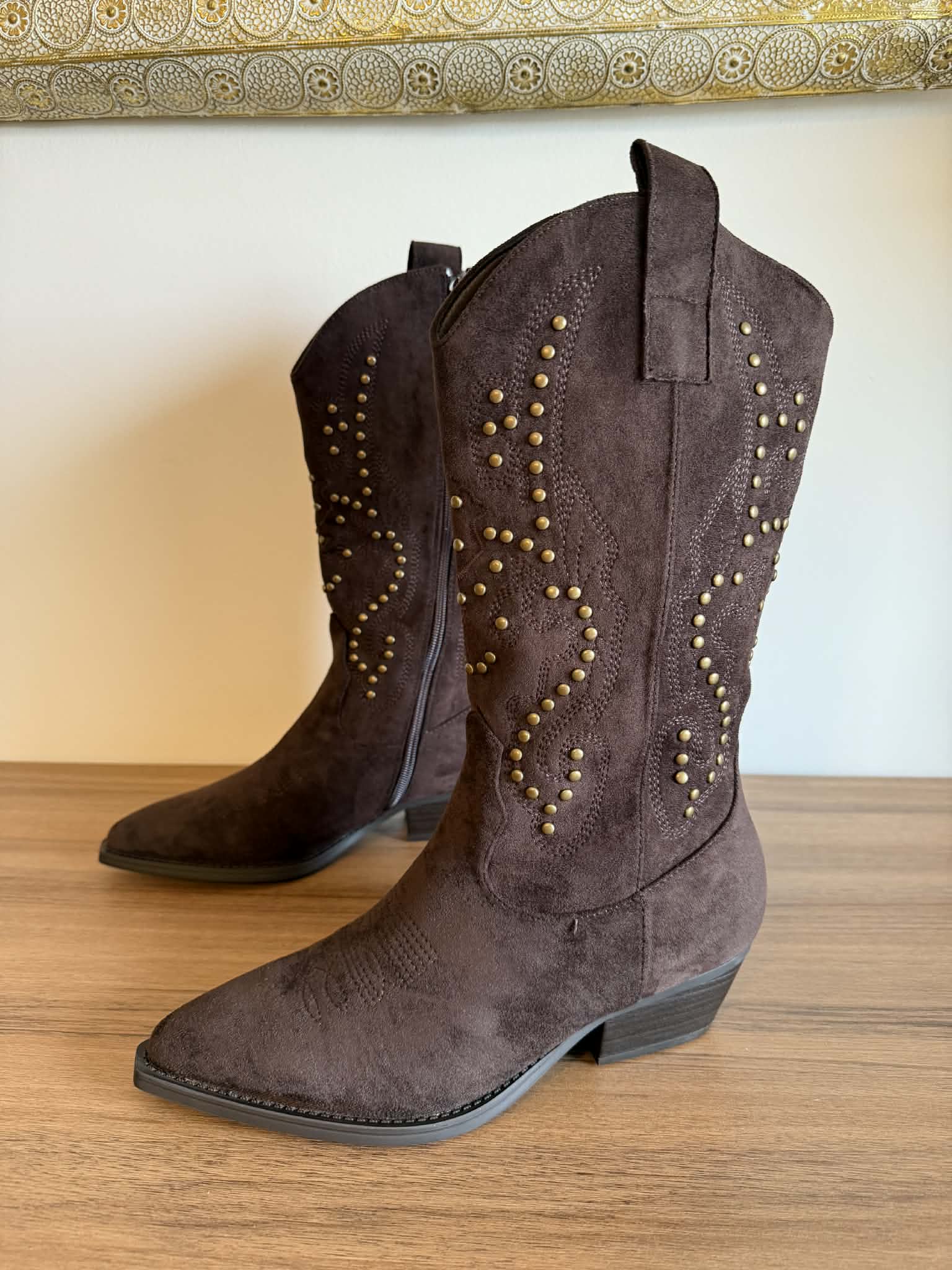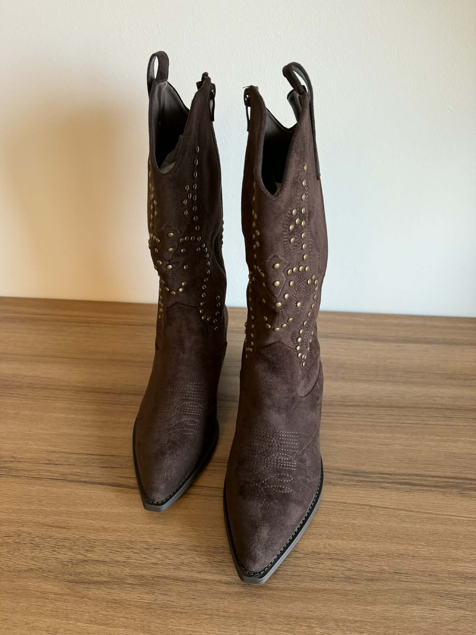 Bota de cano alto estilo texana. Em camurça sintética. Com fecho. Tachas douradas decorativas. Frente bicuda. Salto largo com apenas 5cm de altura.
