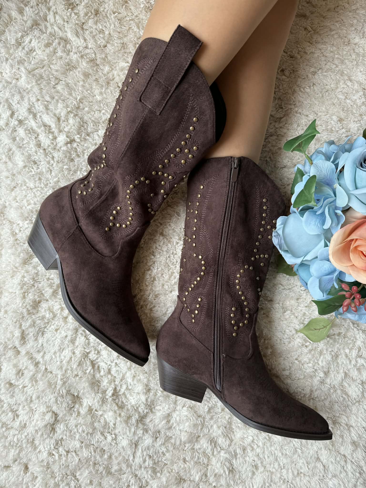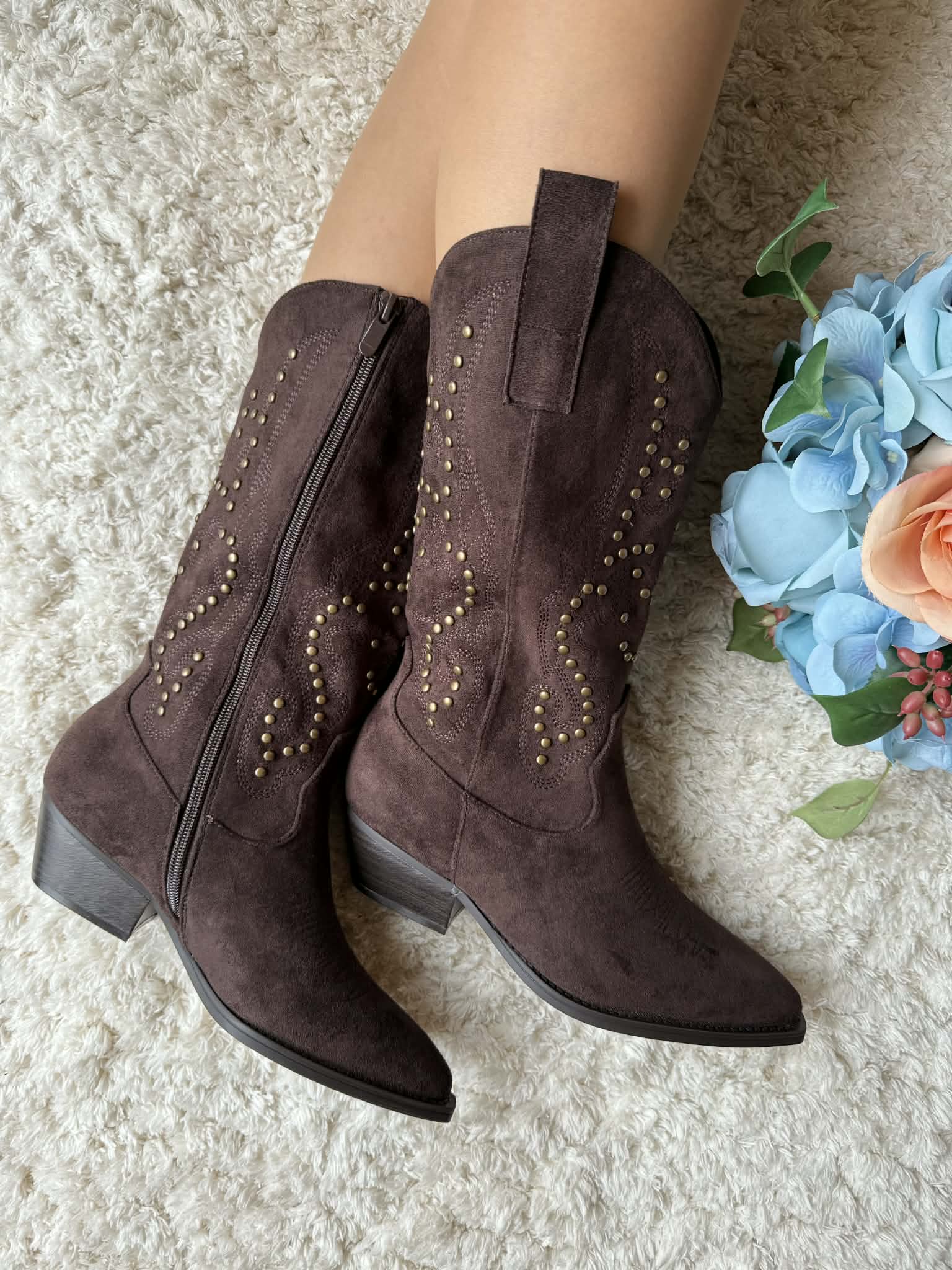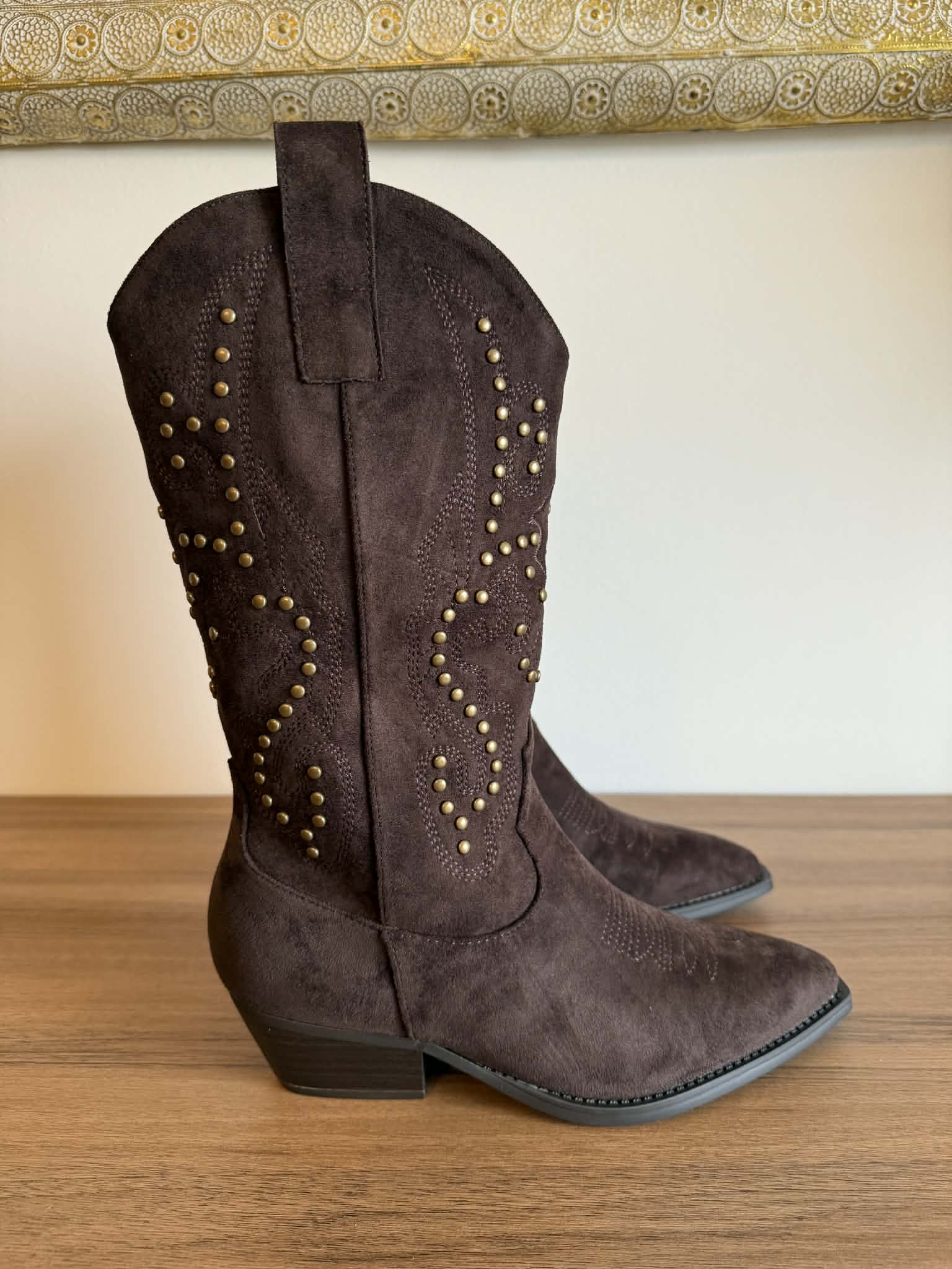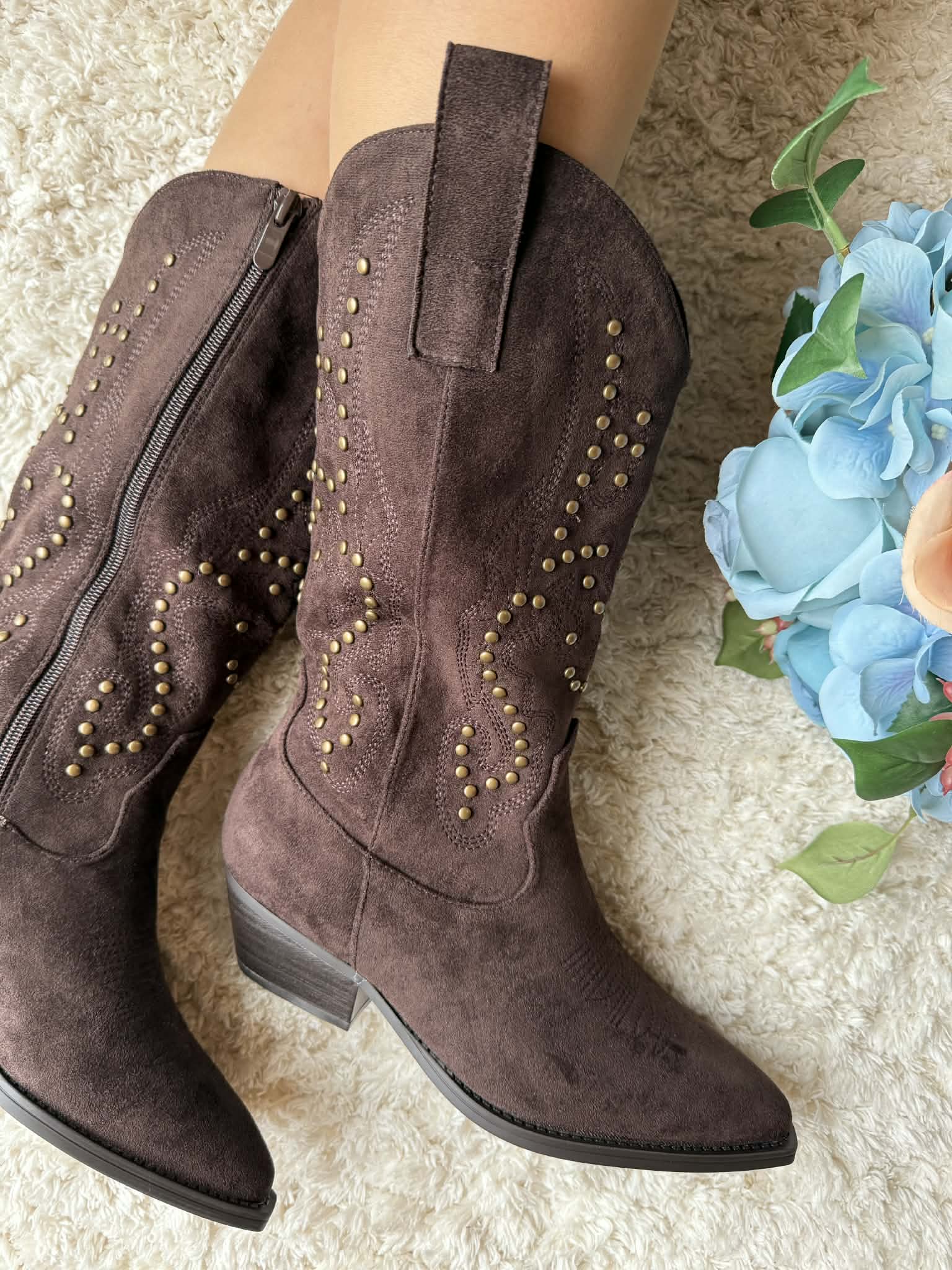 Bota de cano alto estilo texana. Em camurça sintética. Com fecho. Tachas douradas decorativas. Frente bicuda. Salto largo com apenas 5cm de altura.