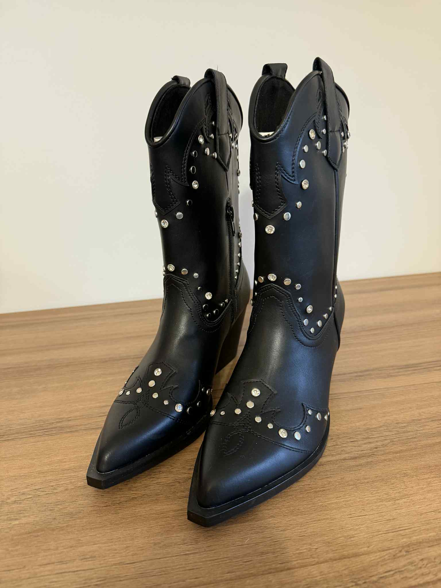 Texana preta, em pele sintética, da marca Corina, Tem fecho. Estilo texana, com frente bicuda e salto largo com 6cm de altura. Detalhes decorativos de tachas e brilhantes.
