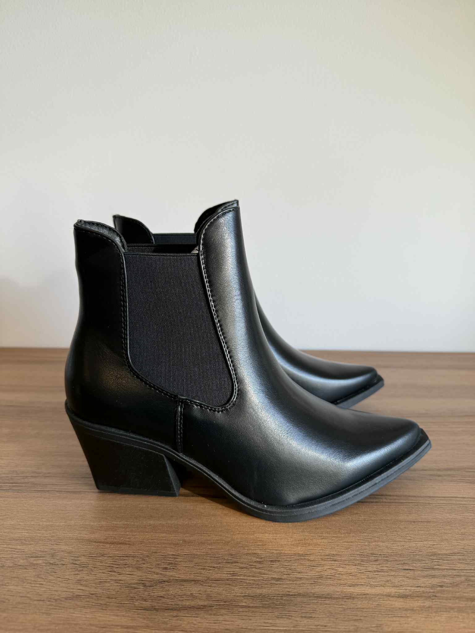 Botim feminino bicudo, em pele sintética. Com elásticos. Salto largo com 6cm de altura.